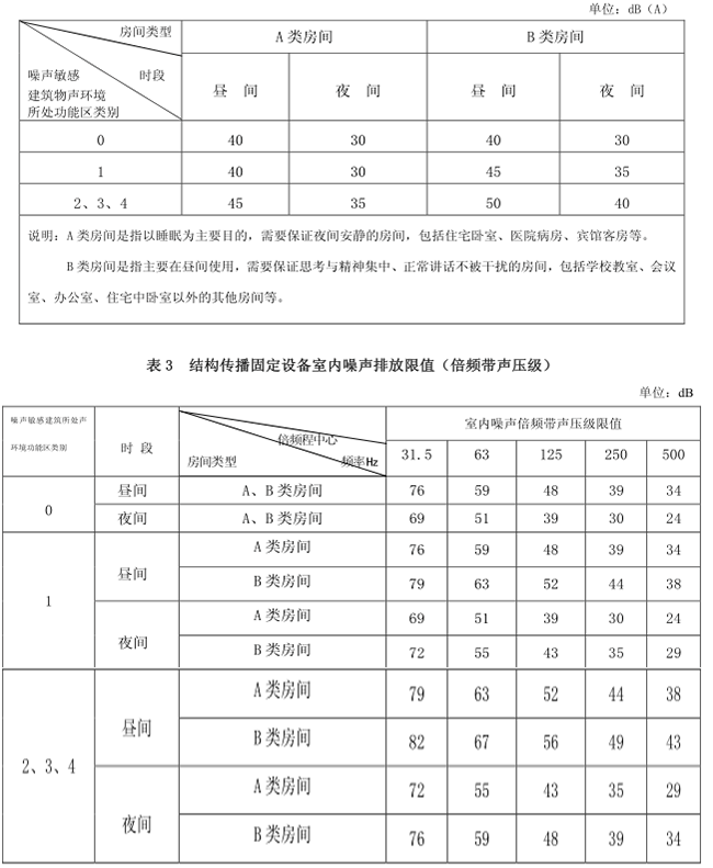 表2 結(jié)構(gòu)傳播固定設(shè)備室內(nèi)噪聲排放限值(等效聲級(jí))